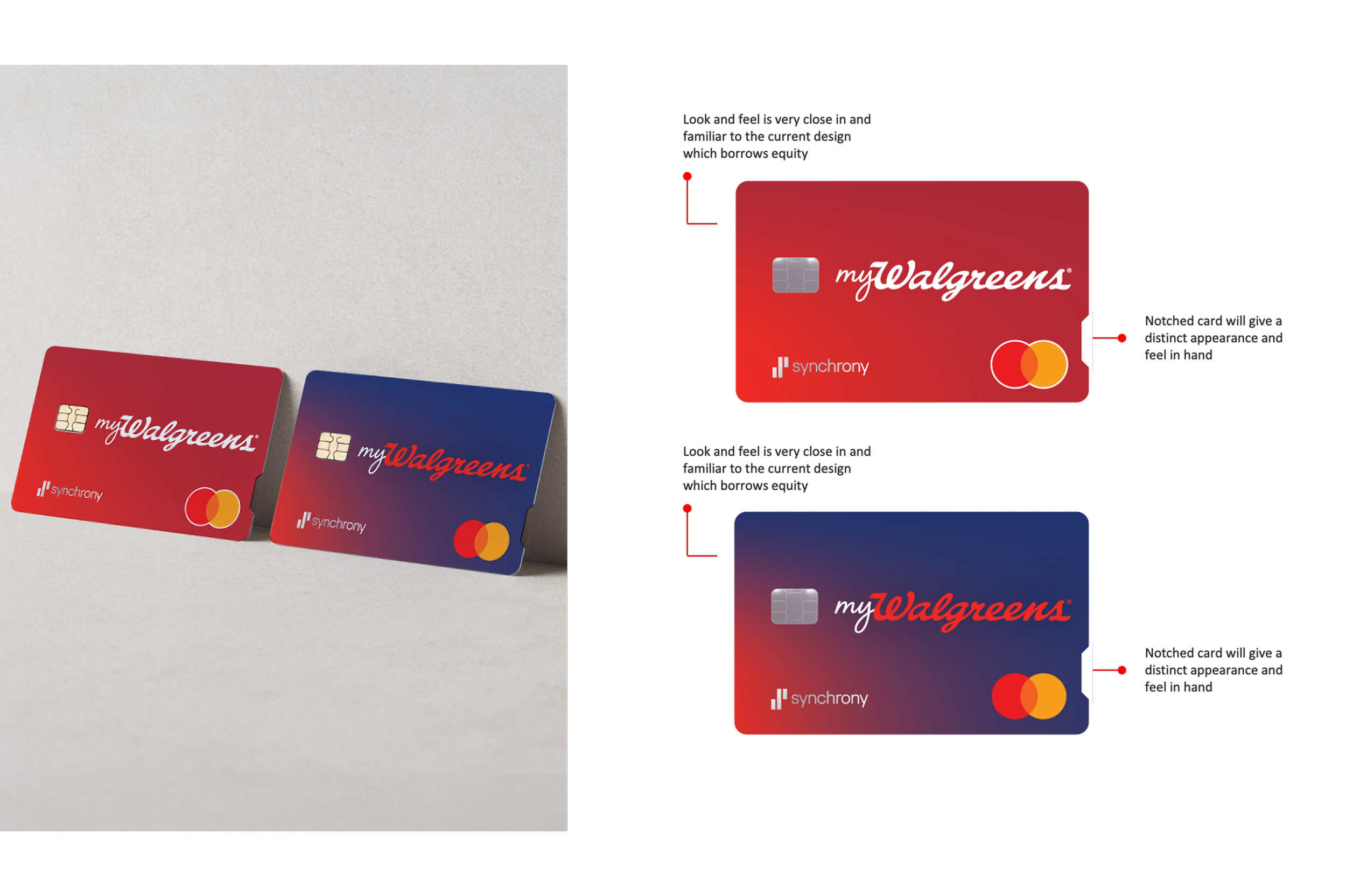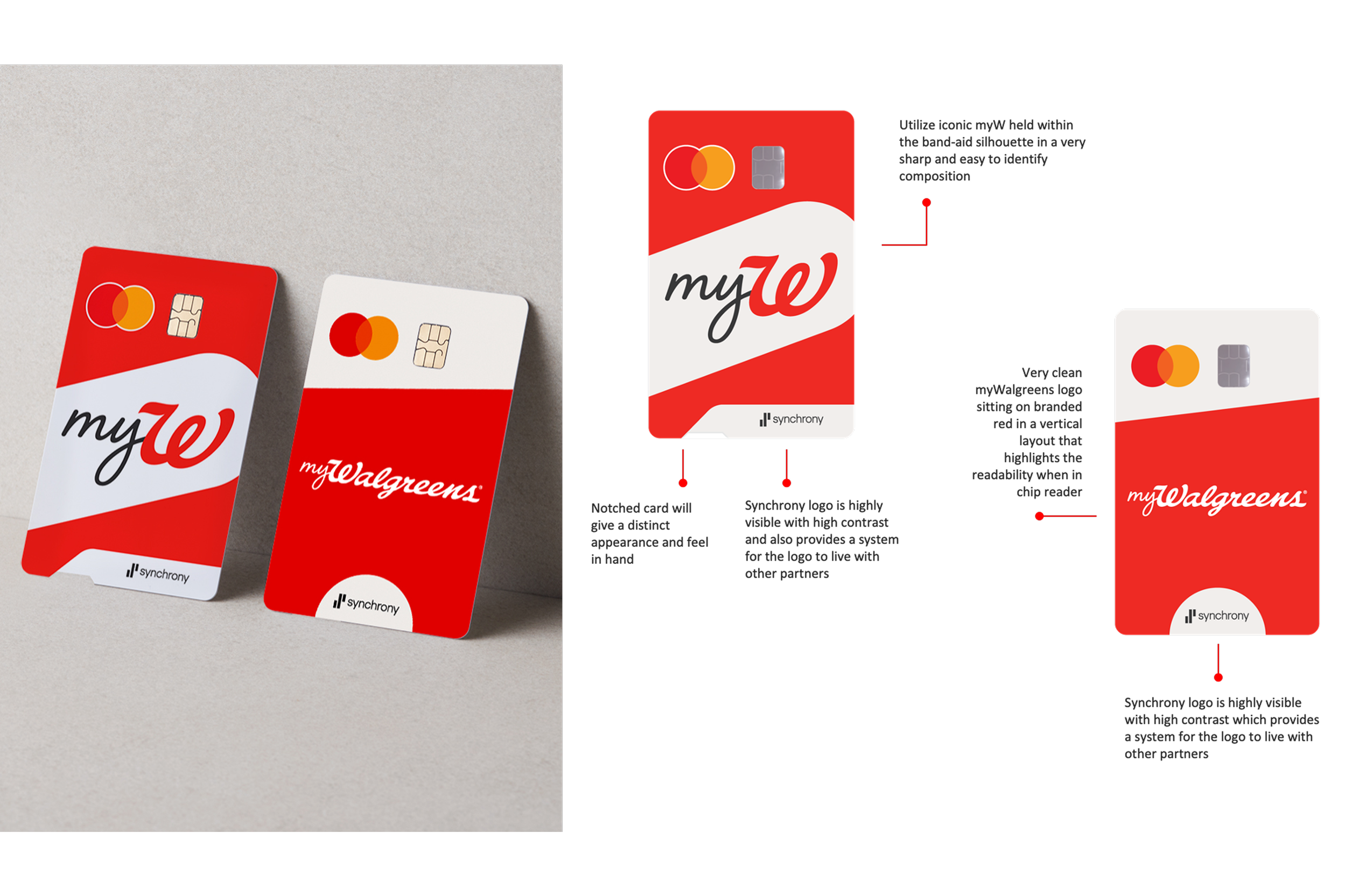 For the Walgreens card, I explored several creative directions to showcase its strong, customer-recognized identity within the newly defined system. Each concept thoughtfully prioritized Walgreens’ equity by featuring its signature red, iconic “W,” and familiar cues, while integrating Synchrony branding in a clear but subordinate role. Design elements like color blocking, distinctive notches, and bold vertical layouts made the card visually memorable while meeting functional and brand hierarchy requirements.